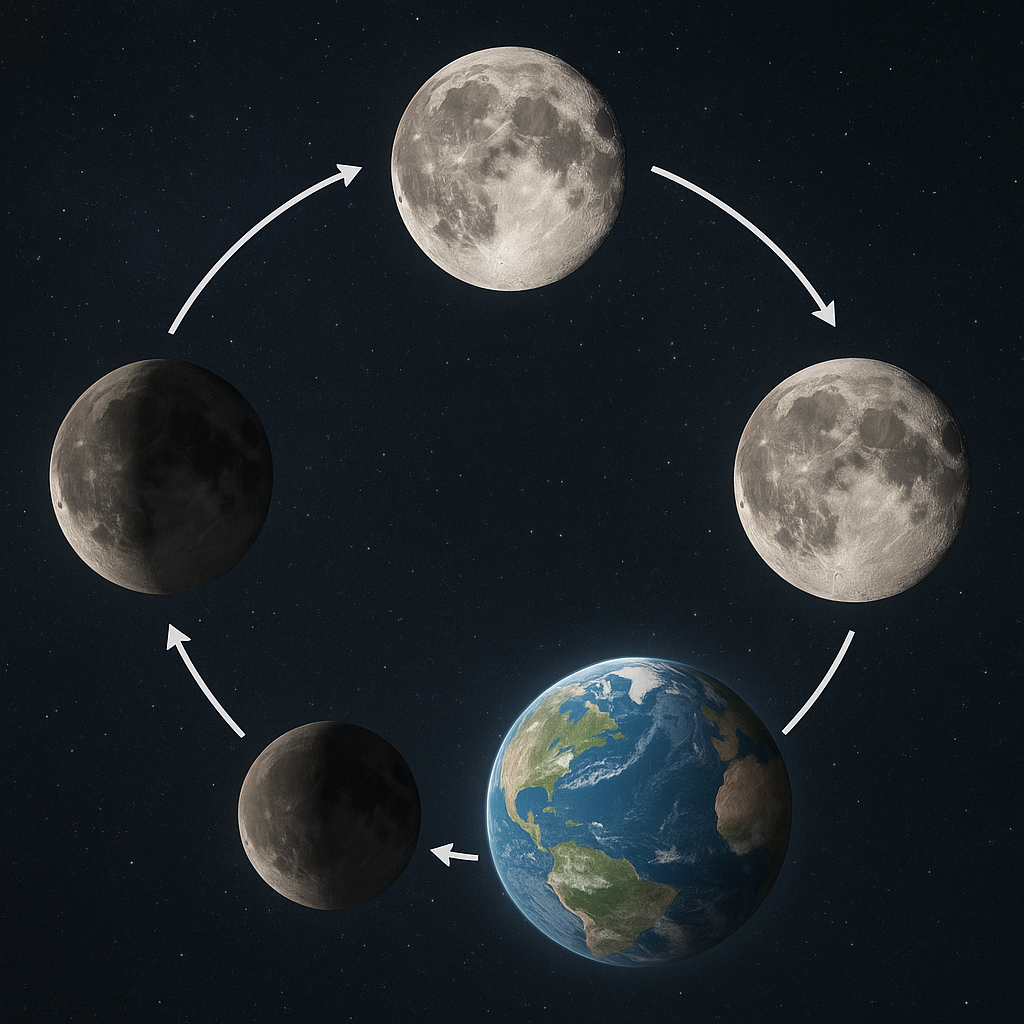 Der Mond umkreist die Erde auf einer leicht elliptischen Umlaufbahn mit einer mittleren Entfernung von etwa 384 400 Kilometern. Ein vollständiger Umlauf dauert knapp 27,3 Tage und wird als siderischer Monat bezeichnet. Dabei verändern sich Licht- und Schattenverhältnisse auf seiner Oberfläche, was wir als unterschiedliche Mondphasen wahrnehmen.