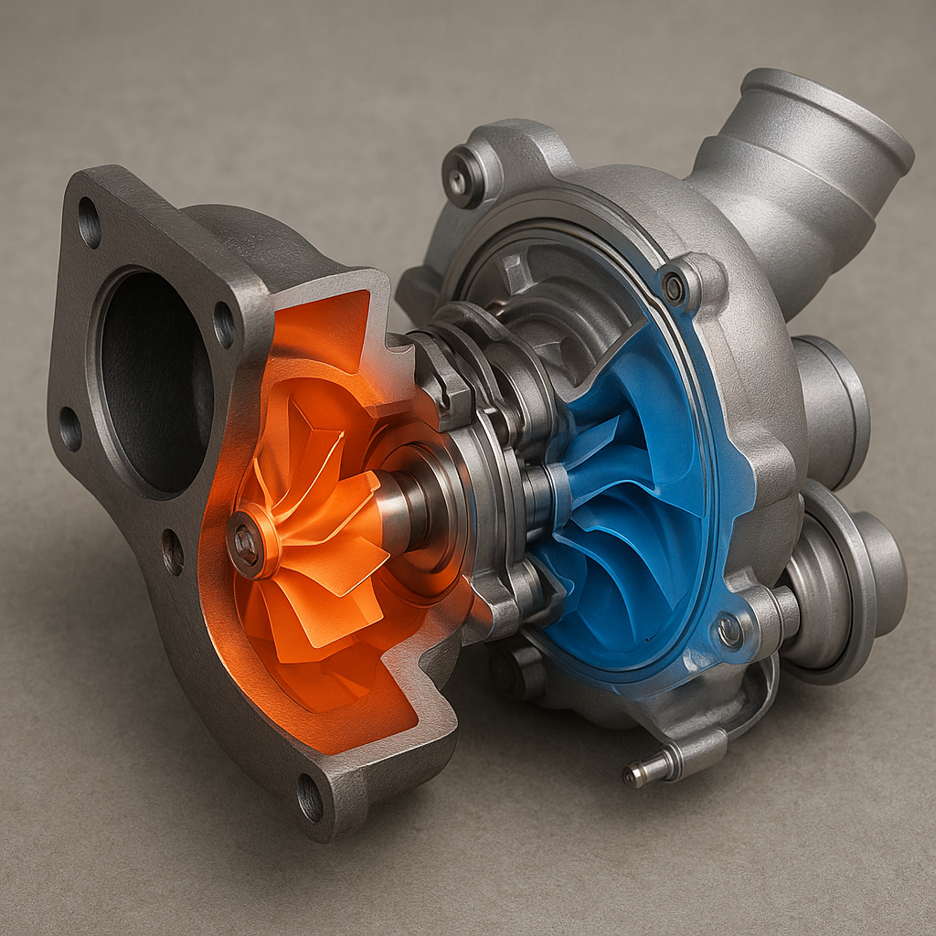 Ein herkömmlicher Turbolader besteht im Wesentlichen aus zwei Hauptkomponenten, die auf einer gemeinsamen Welle montiert sind: der Turbine und dem Kompressor. Die Turbine wird auf der Abgasseite des Motors platziert und wandelt die austretende Abgasenergie in Rotationsbewegung um. Diese Rotationsenergie treibt über die Welle den Kompressor an, der auf der Ansaugseite die Frischluft verdichtet.