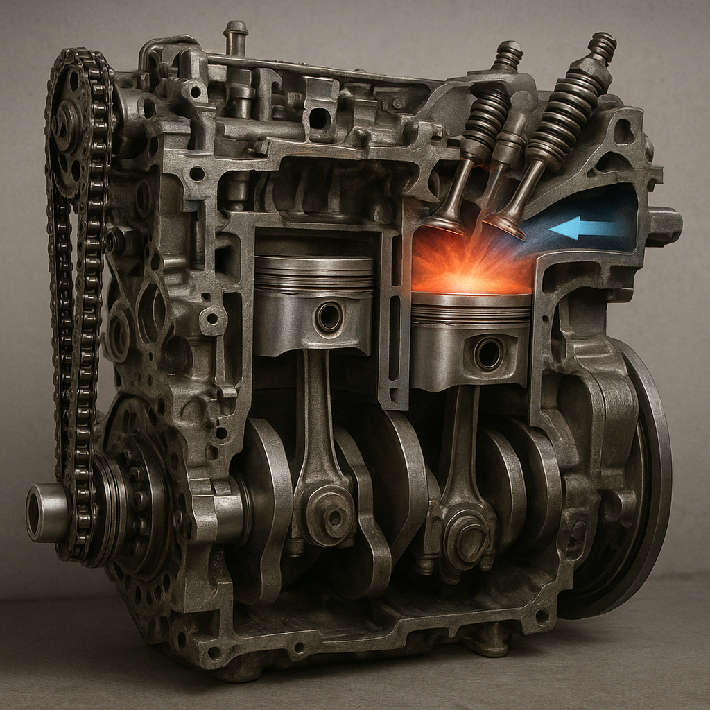 Dieser Viertaktprozess wiederholt sich tausende Male pro Minute. Die lineare Bewegung der Kolben wird über Pleuel und Kurbelwelle in eine rotierende Kraft umgesetzt. So entsteht die Antriebsdrehzahl, die letztlich über Getriebe und Antriebswellen auf die Räder übertragen wird.