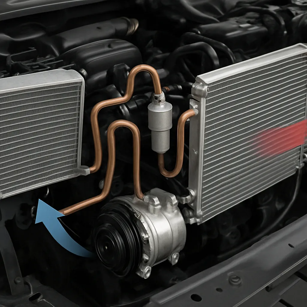 • Verdampfer – im Innenraum nimmt das kalte, flüssige Kältemittel Wärme auf und verdampft, wodurch die Luft gekühlt wird.